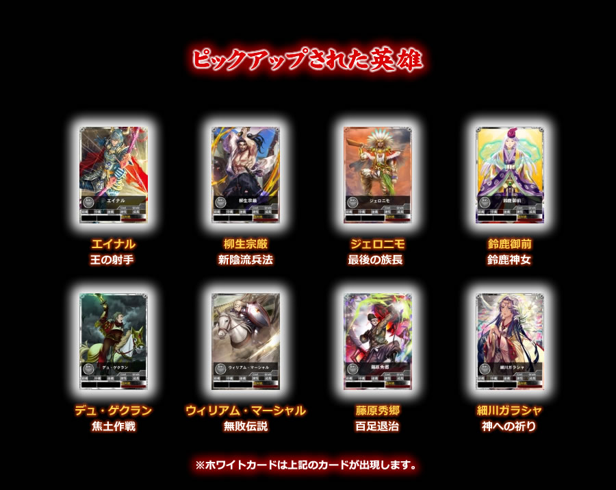 エイナル 柳生宗厳 ジェロニモ 鈴鹿御前 デュ・ゲクラン ウィリアム・マーシャル 藤原秀郷 細川ガラシャ